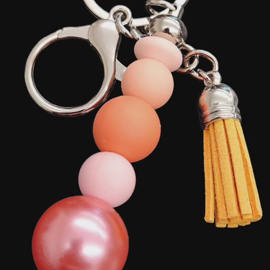 This handcrafted keychain features a beautiful combination of peach and apricot-colored beads, culminating in a large, eye-catching apricot accent bead. The vibrant colors and delicate design make it a stylish accessory for your keys, bag, or backpack.