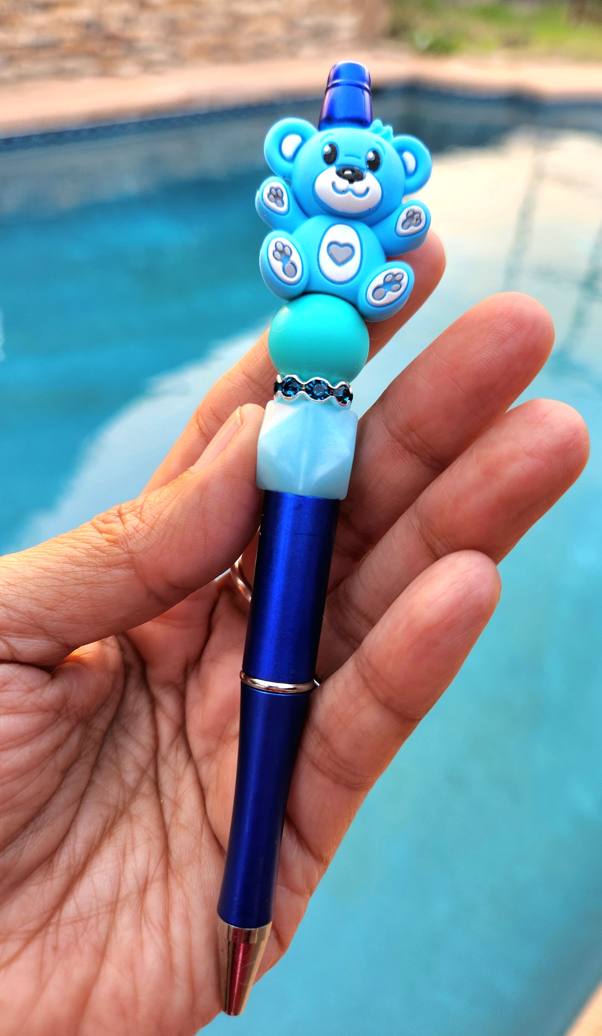 Imagine the joy of writing with this unique pen, featuring an adorable 3D blue bear charm perched atop a shimmering arrangement of rhinestone beads. Below, a captivating hexagon blue marble bead adds a touch of elegance and intrigue.