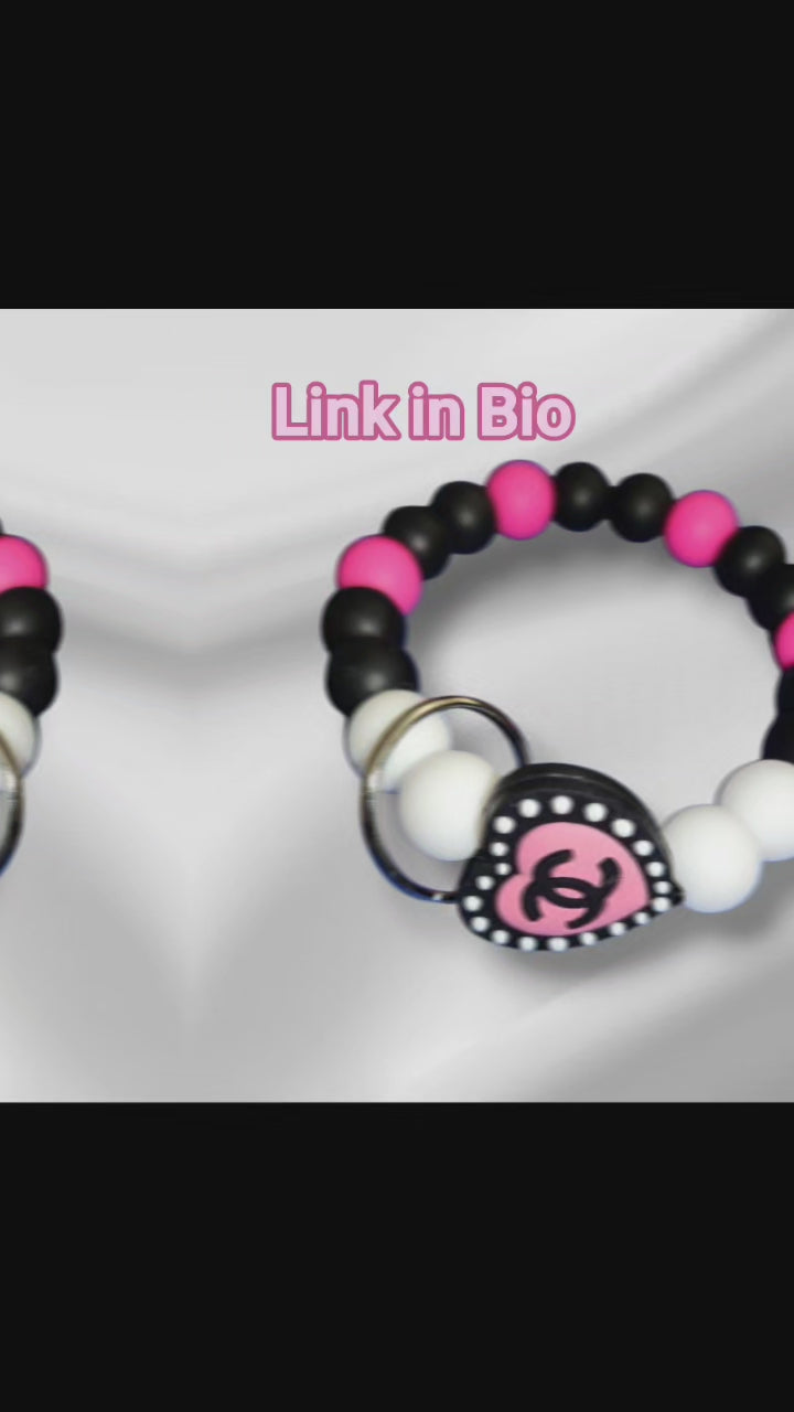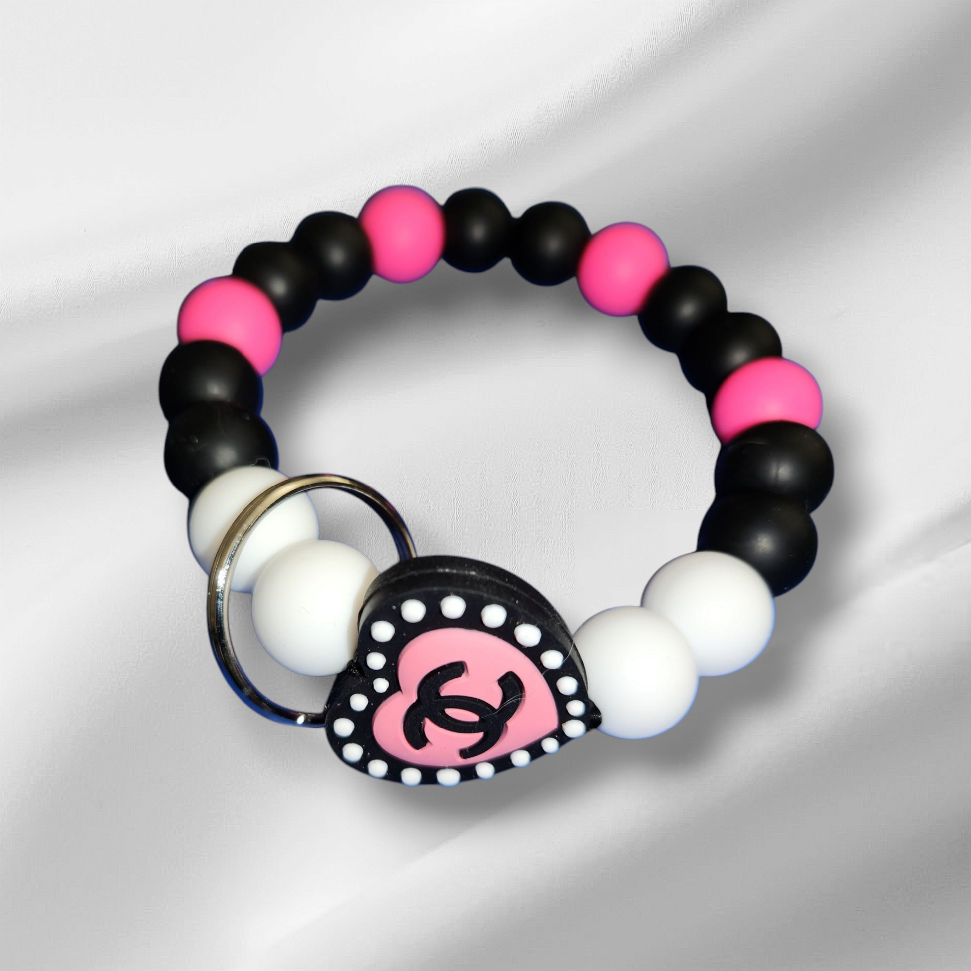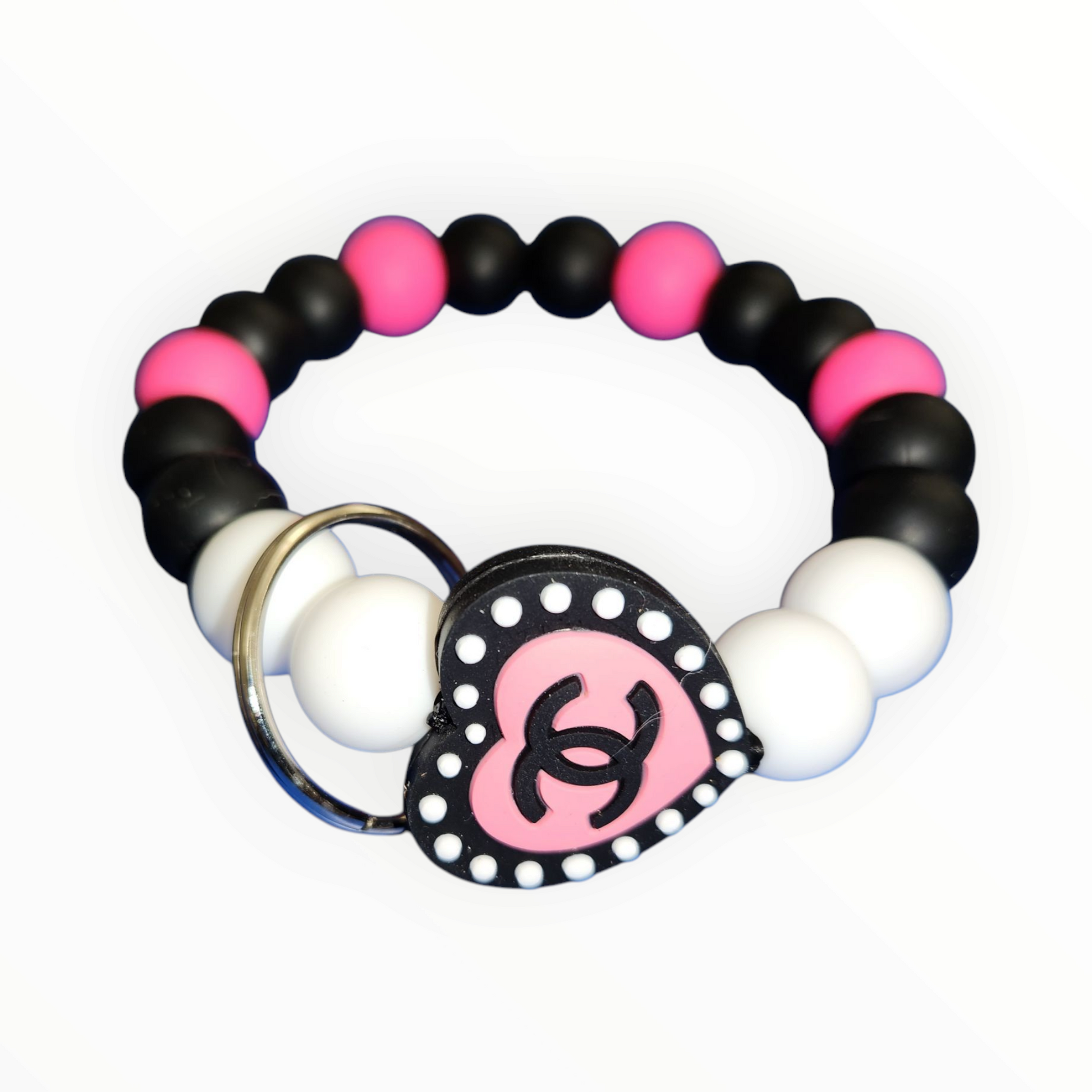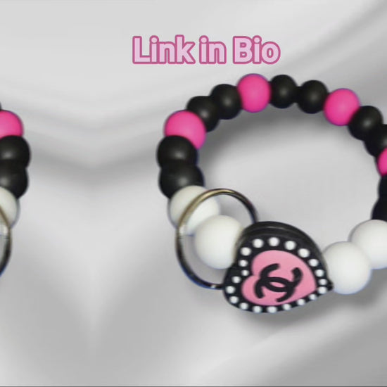 Adorn your wrist with this handcrafted beaded wristlet keychain. Featuring a stylish Chanel-inspired charm, playful pink, classic black & white beads, and a fun tassel. Keep your keys handy and your look on point!