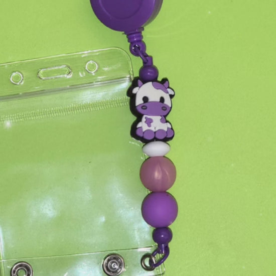 This eye-catching badge reel features a cute purple and white cow charm, accented with coordinating purple and pink beads. It's the perfect way to add a touch of personality to your work or school ID.
