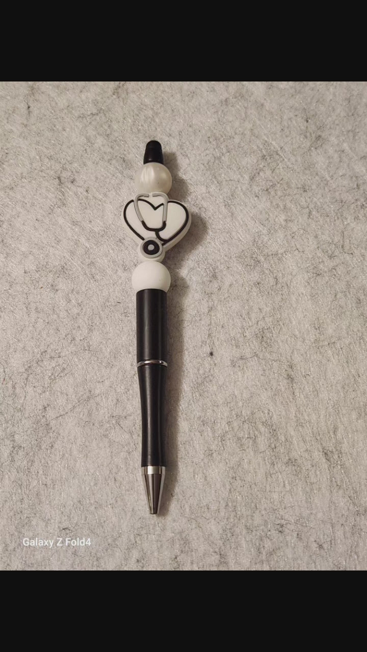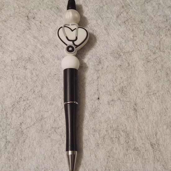 Experience the artistry of our handcrafted beaded pen. Featuring a sleek black barrel, a luminous white Mother of Pearl bead, and a delicate heart charm entwined with a stethoscope, this pen is a symbol of sophistication and care. Perfect for gifting to that special healthcare professional or adding a touch of unique style to your own desk.