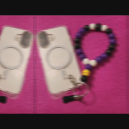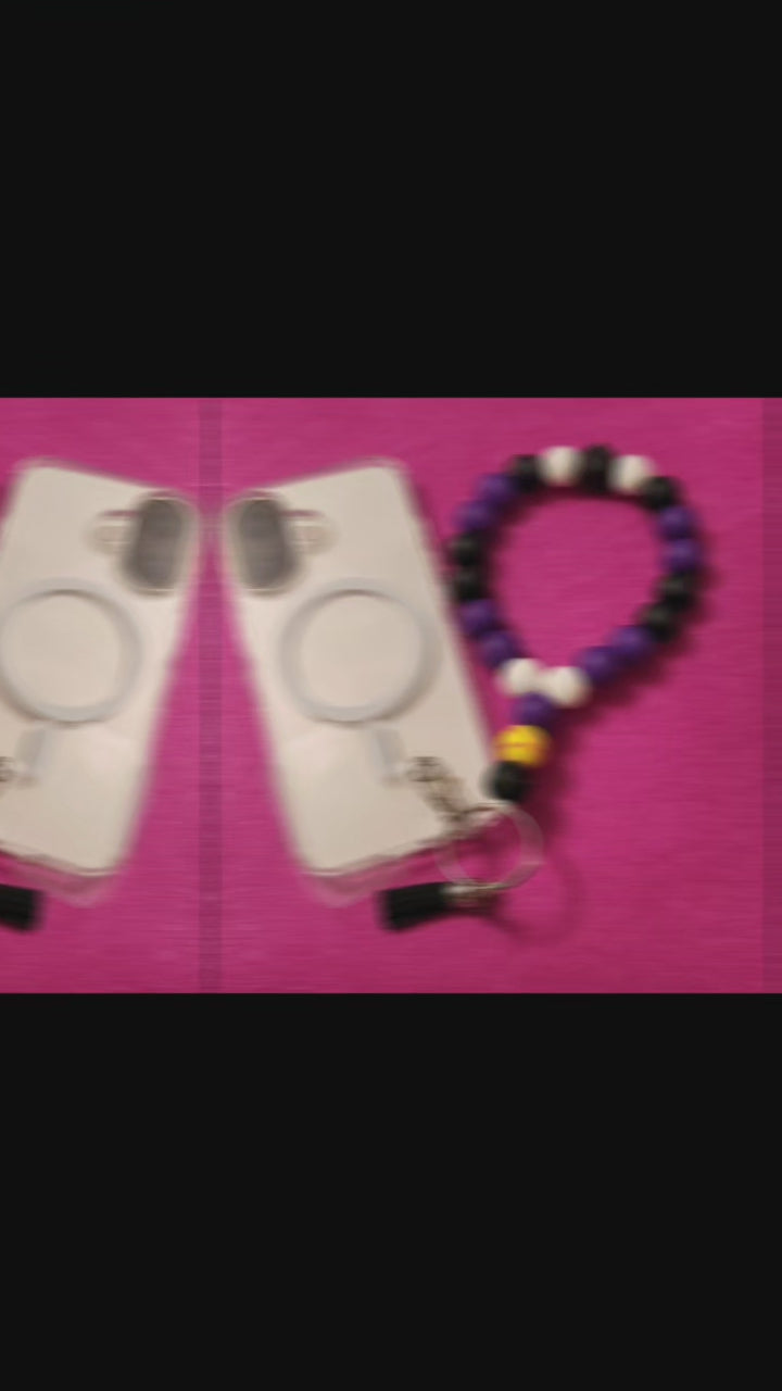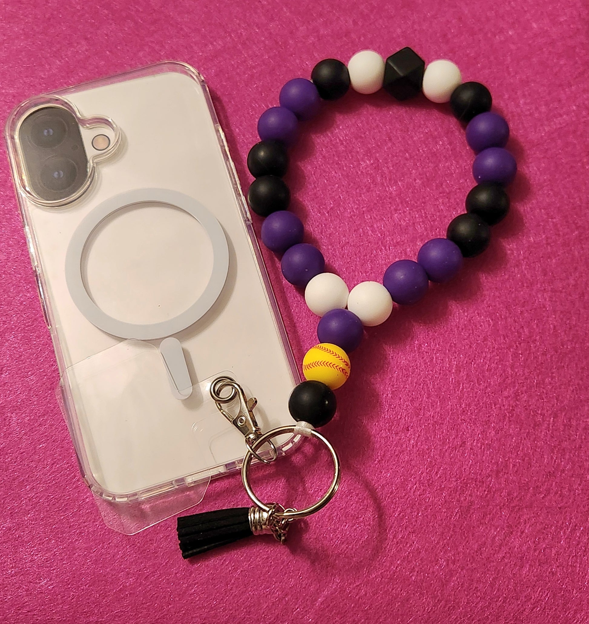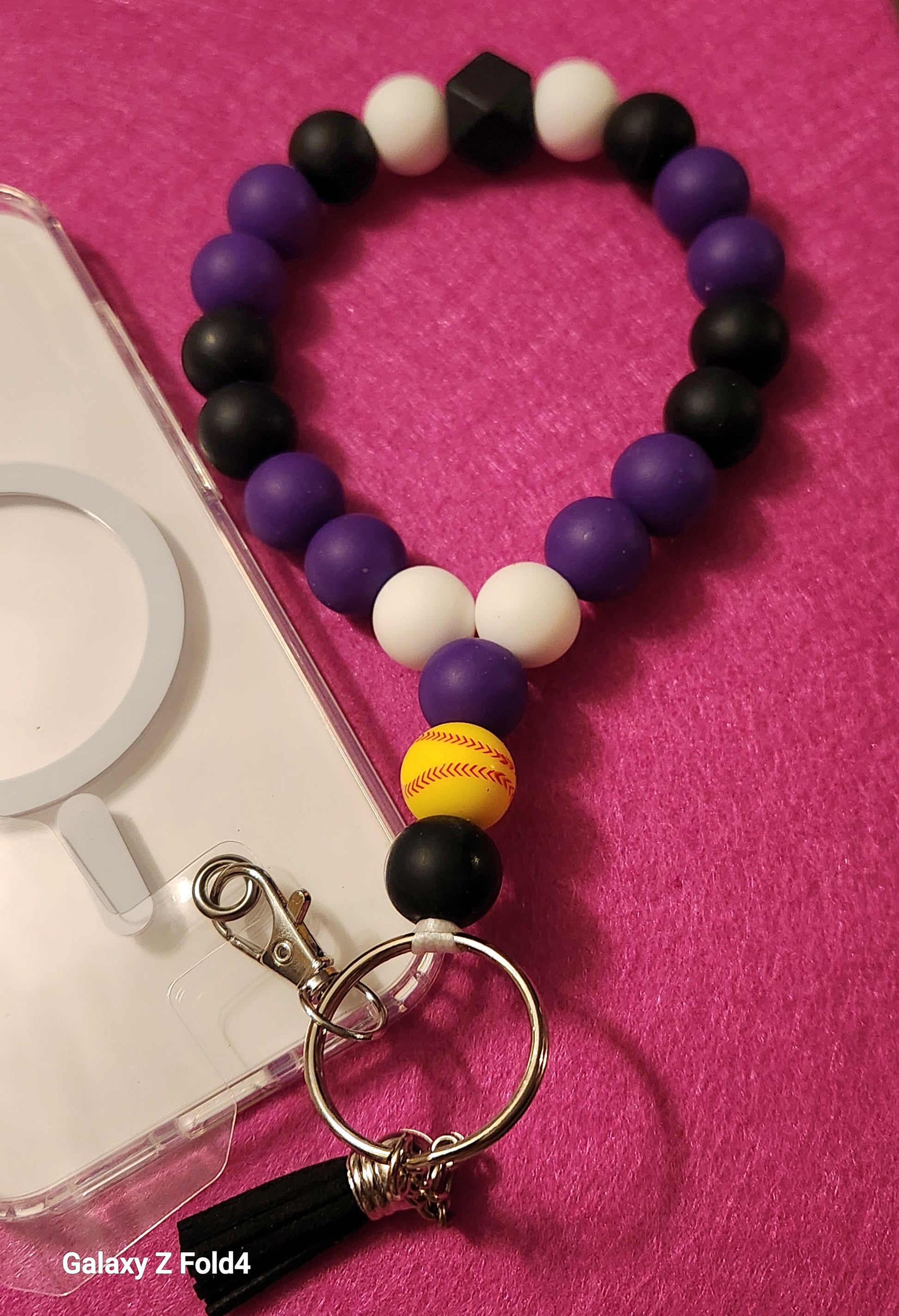 Add a pop of personality to your phone! 💜🖤🤍 This handcrafted beaded wristlet features a fun softball bead and a stylish tassel. Keep your phone secure and stylish.