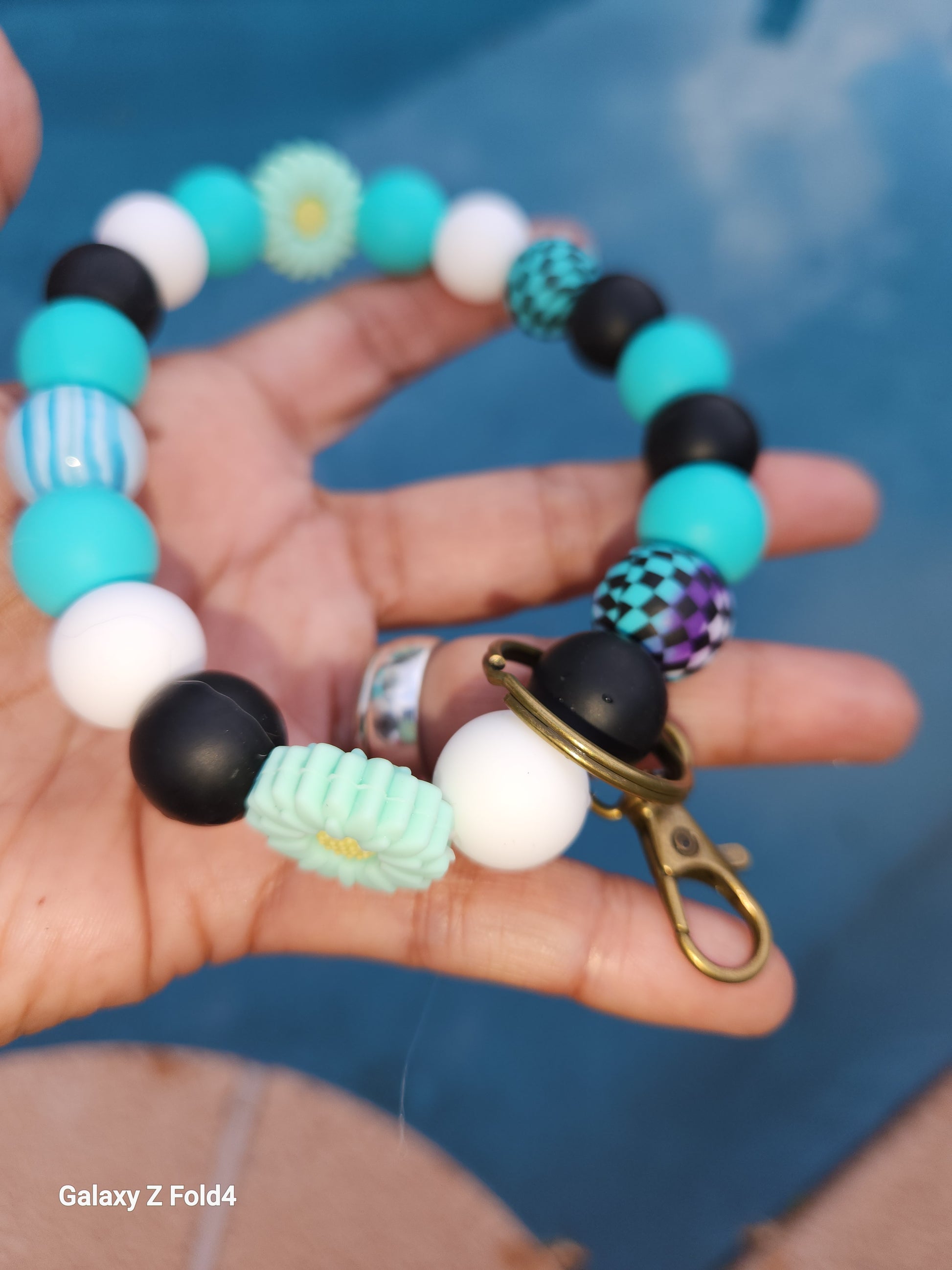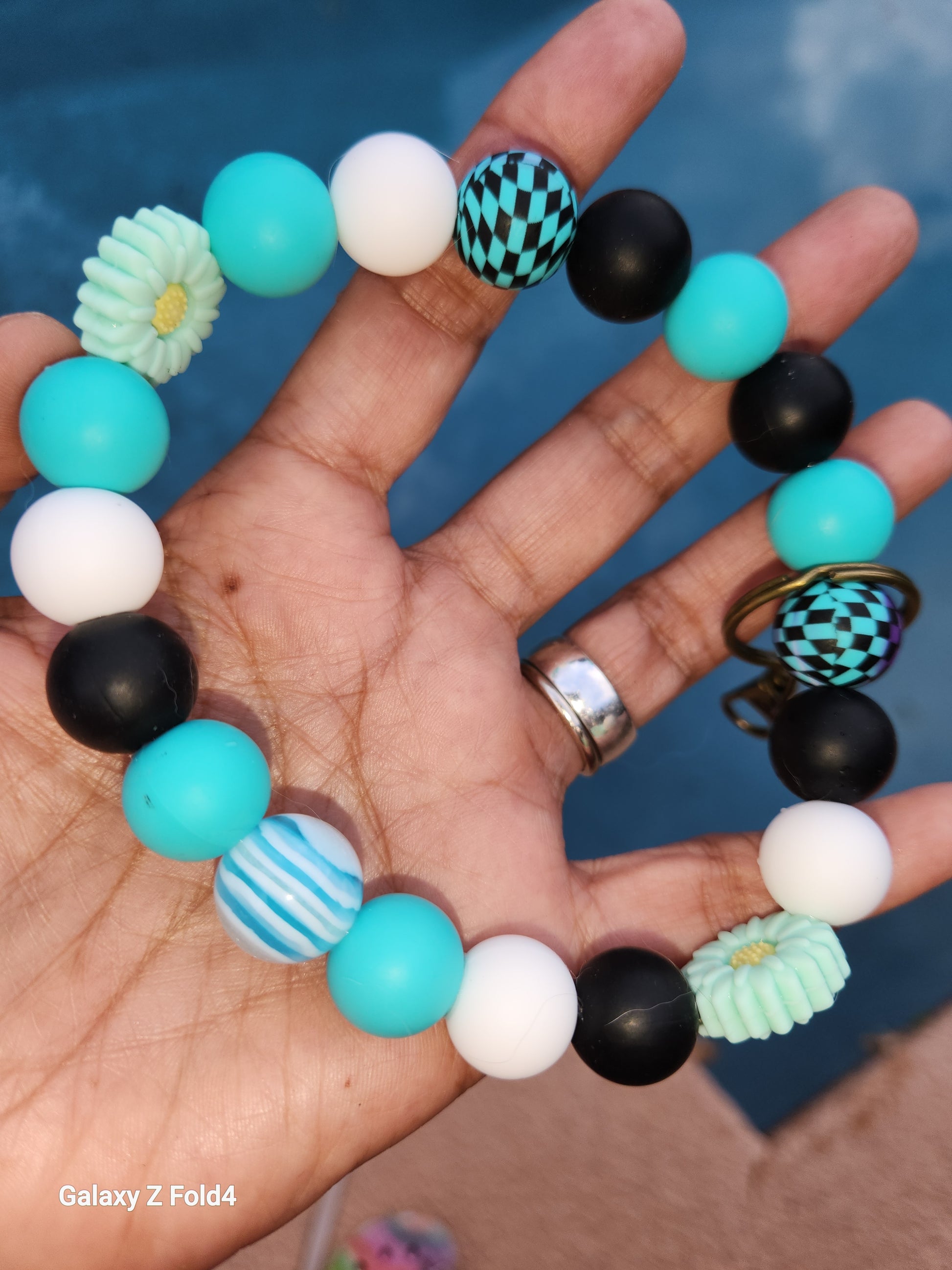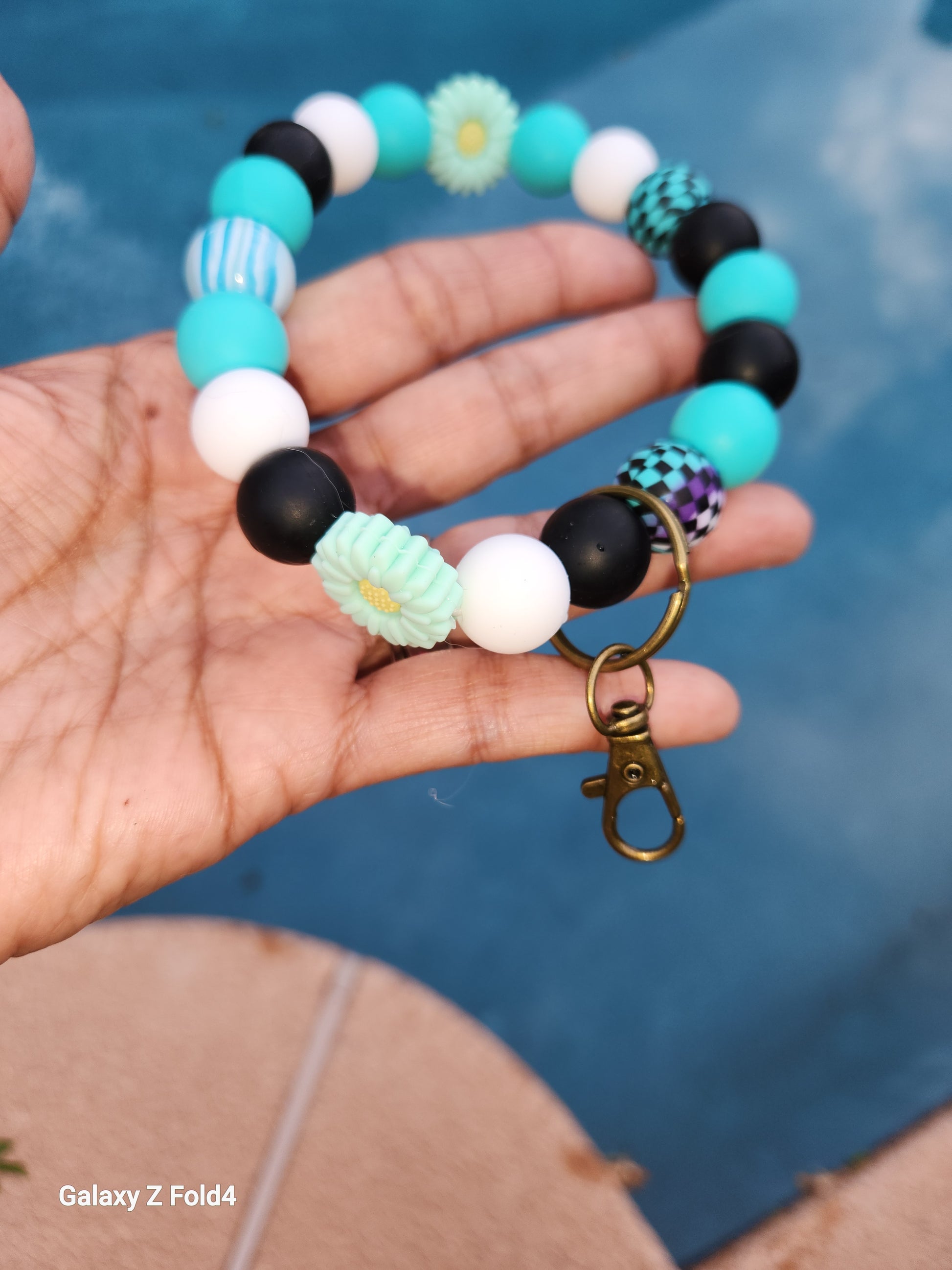 #HandmadeKeychain #BeadedWristlet #TealFlowers #CheckeredBeads #GlassBeads #UniqueGift #HandcraftedJewelry #FashionAccessory #EverydayStyle