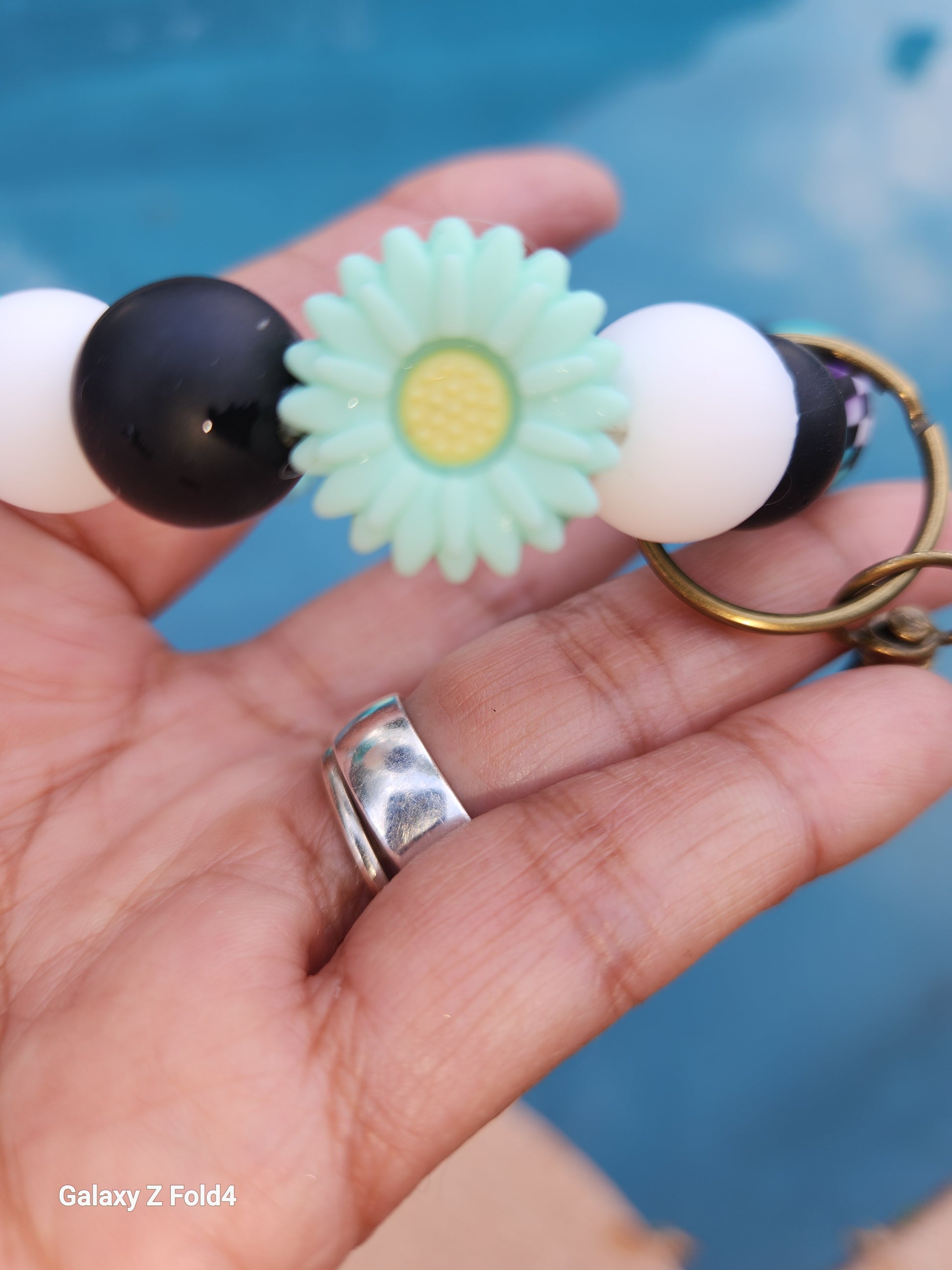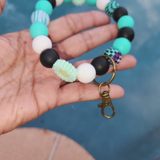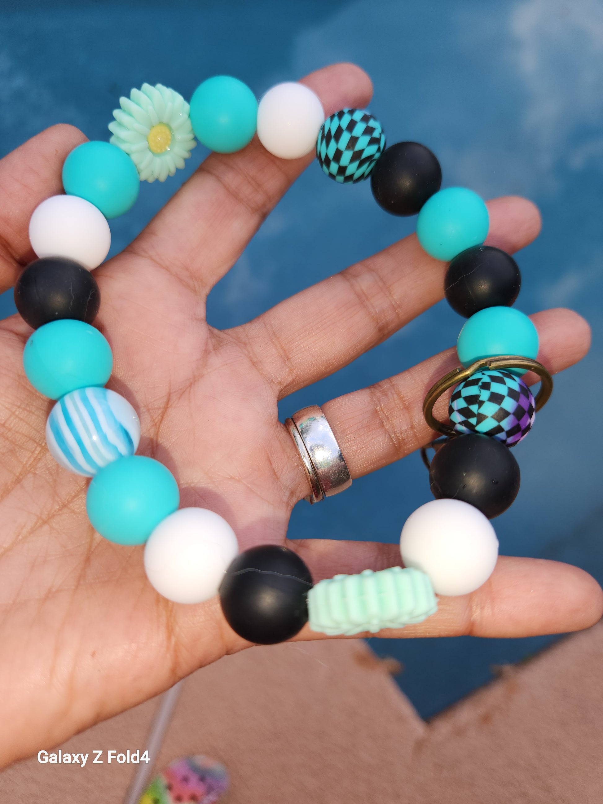 #HandmadeKeychain #BeadedWristlet #TealFlowers #CheckeredBeads #GlassBeads #UniqueGift #HandcraftedJewelry #FashionAccessory #EverydayStyle