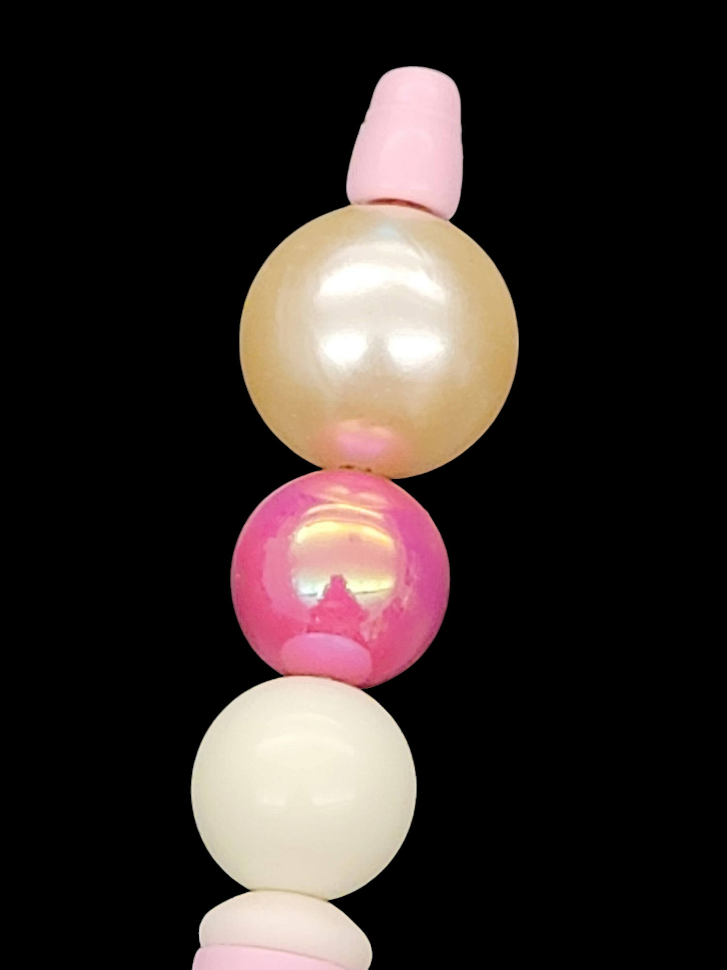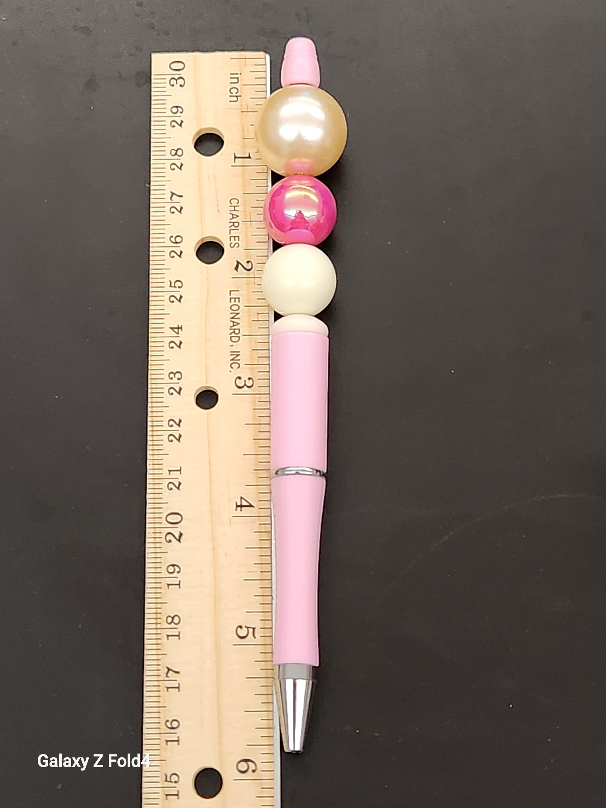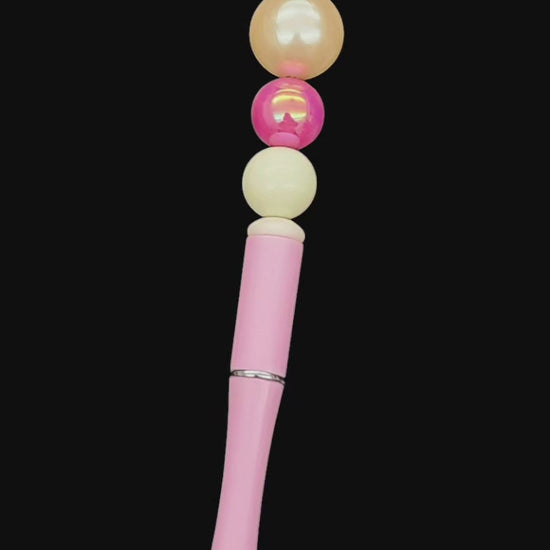 This handcrafted beaded pen features stunning pink iridescent beads that catch the light beautifully. Perfect for adding a touch of elegance to your desk or as a thoughtful gift. Handmade with care.