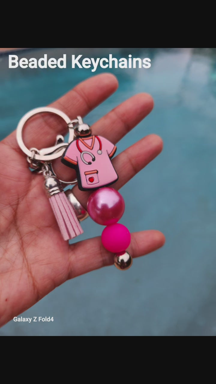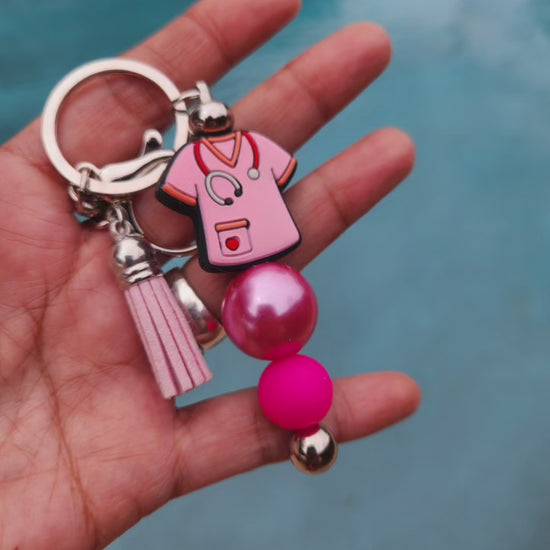This unique keychain features a pink scrub top with a stethoscope, a matching pink tassel, and vibrant beads. It's the perfect way to add a touch of personality to your keys, bag, or backpack.