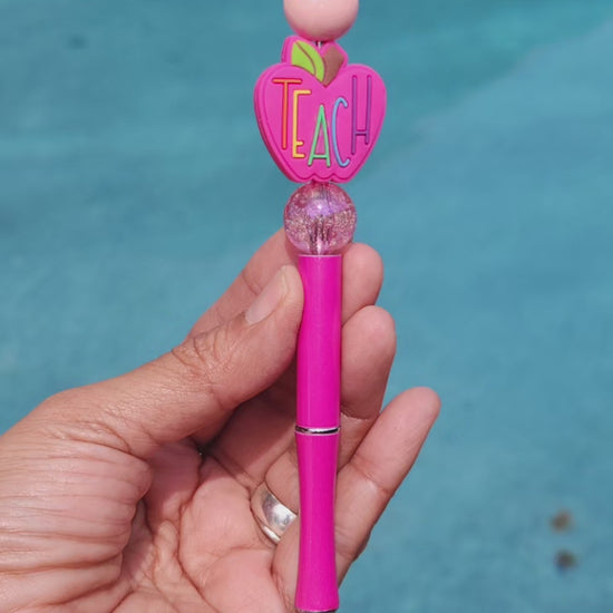 Add a touch of fun and flair to your everyday teaching tasks with this handcrafted beaded pen. Featuring a vibrant pink barrel, a glittery "TEACH" heart, and adorable beaded accents, this pen is sure to brighten your day. Plus, you'll receive an extra pencil tip so you can keep on writing!