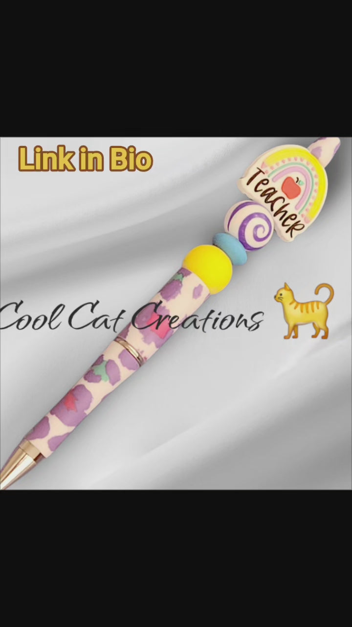 Show your appreciation with this adorable handcrafted beaded pen! Featuring a sweet "Teacher" rainbow design with an apple, a fun purple and white spiral bead, and a stylish pink, blue, and purple animal print. Makes a perfect gift!