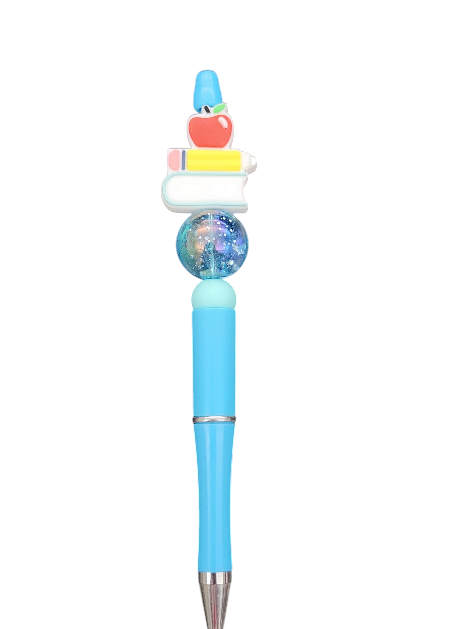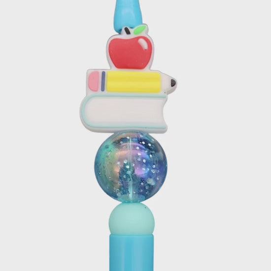 This delightful pen features a stack of miniature books topped with a bright red apple, adding a playful and academic touch. The large iridescent bead catches the light beautifully, making this pen a true statement piece.