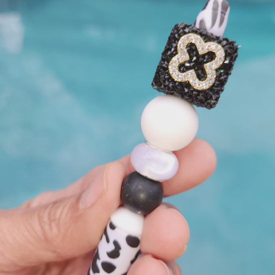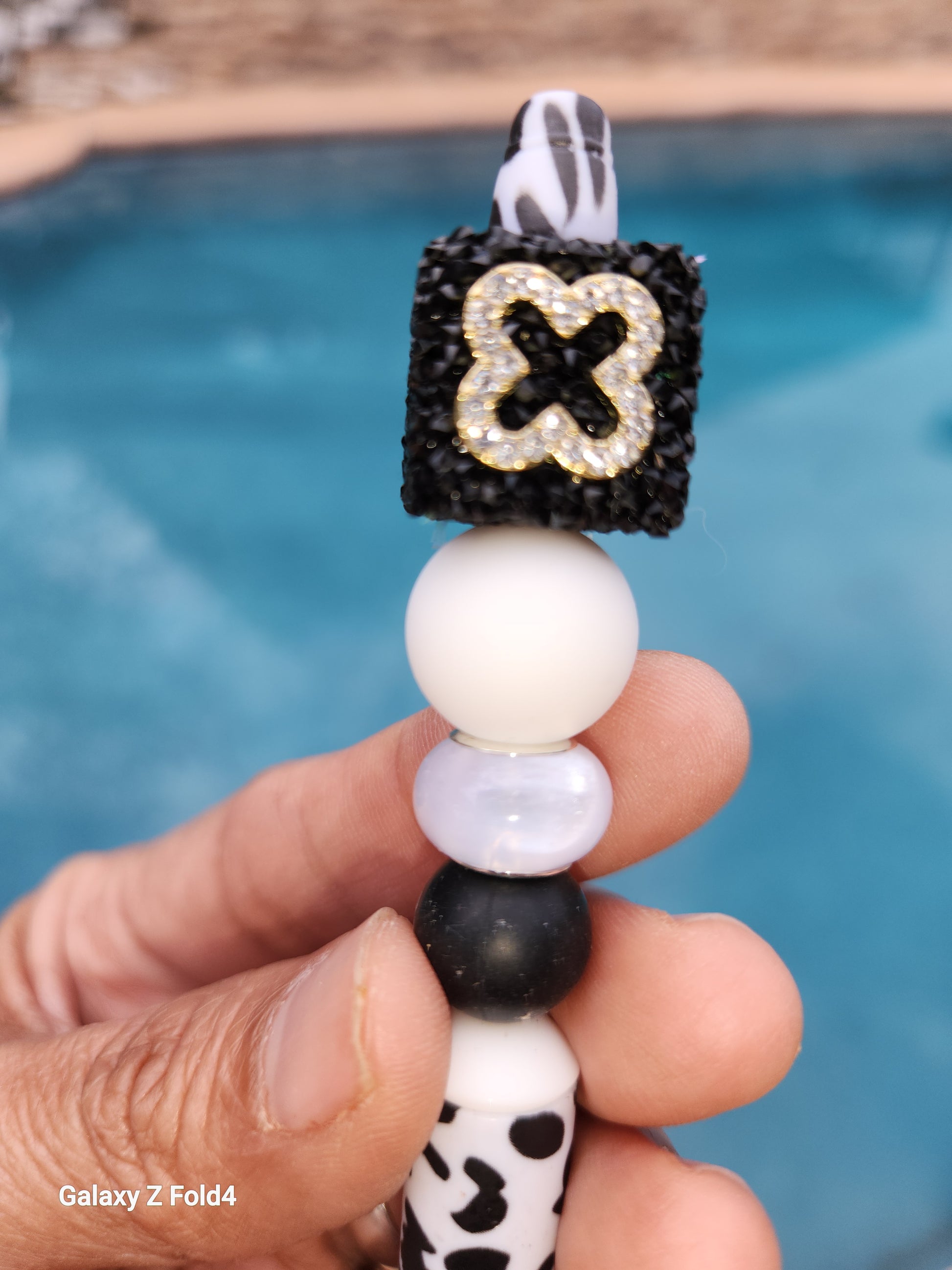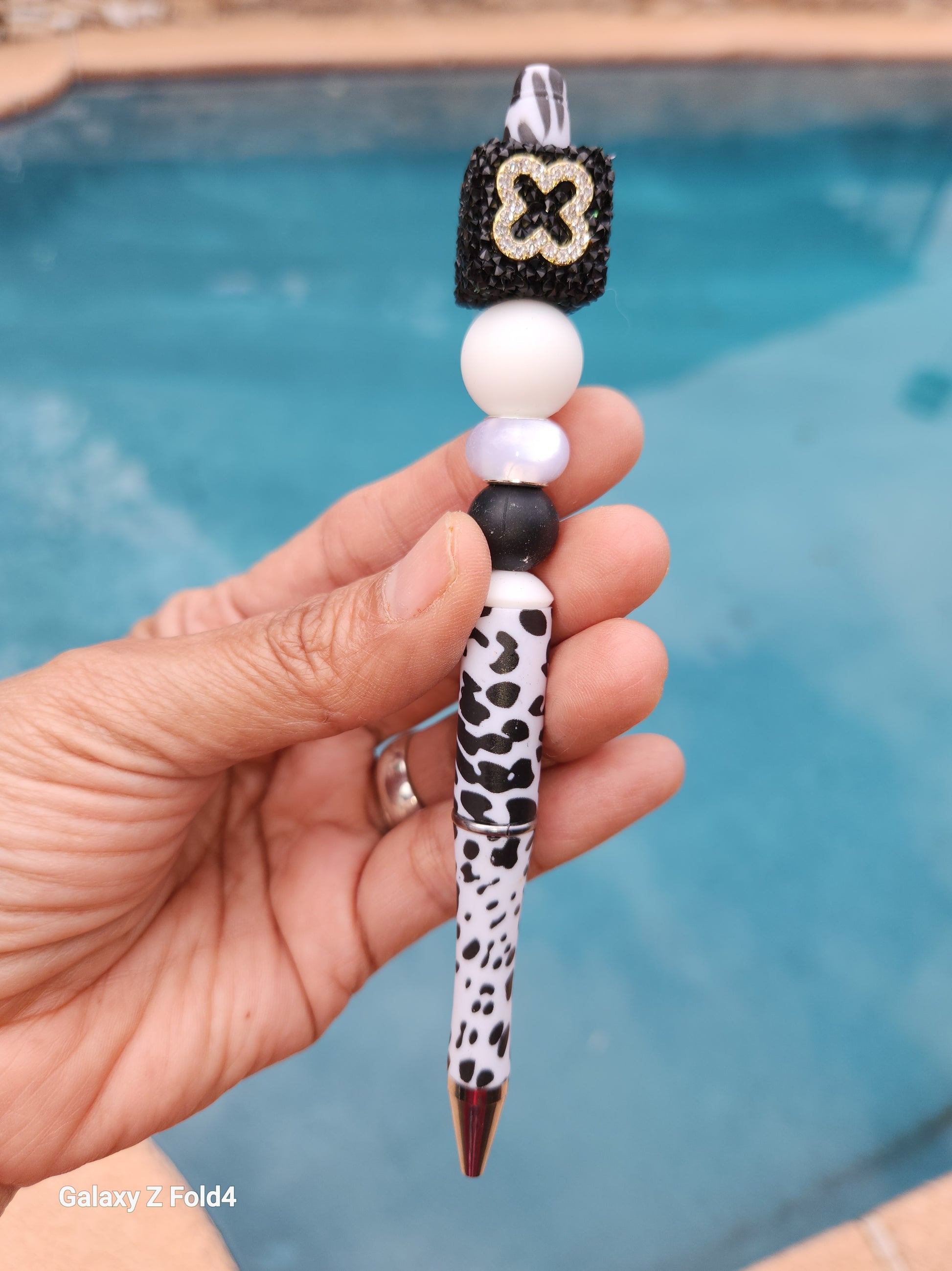 Write in style with this unique and eye-catching pen. This handcrafted beauty features a stunning combination of black, gold, and silver accent beads, including a chic "X" detail. The animal print pen adds a touch of playful elegance, while the smooth white glass accent bead provides a sophisticated contrast.